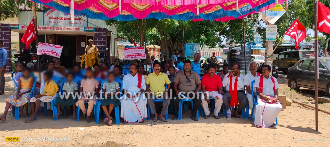 திருச்சி, ஜூலை 25 திருச்சி மாவட்டம் லால்குடி அருகே புள்ளம்பாடி பேரூராட்சியில் அரசு புறம்போக்கு நிலத்தில் காமராஜர் நகர் என உருவாக்கி சுமார் 50 ஆண்டுகளாக குடியிருந்து வரும் இருளர் மற்றும் அருந்ததிய சமுதாய மக்களுக்கு புள்ளம்பாடி பேரூராட்சியில் வீட்டு வரி ரசீது,குடிநீர்,மின்சாரம் மற்றும் வருவாய்த்துறை தடையின்மைச் சான்று வழங்க கோரி குடும்பத்துடன் காத்திருக்கும் போராட்டம் பேரூராட்சி அலுவலகம் முன்பு நடைபெற்றது.