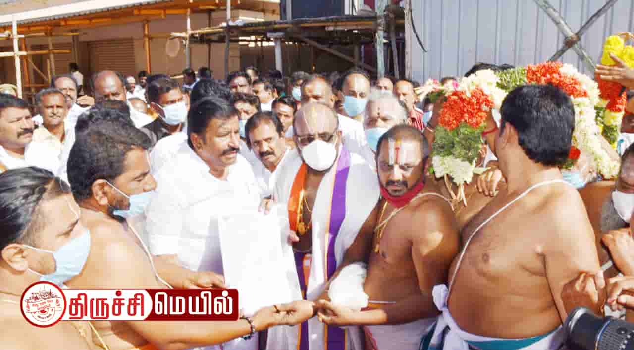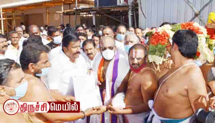அப்போது ஸ்ரீரங்கம் சட்டமன்ற உறுப்பினர் பழனியாண்டி, மத்திய மாவட்ட பொறுப்பாளர் வைரமணி, மாநகரச் செயலாளர் அன்பழகன், சுந்தர் பட்டர், நந்தகுமார் பட்டர் மற்றும் அர்ச்சகர்கள் உள்பட பலர் உடனிருந்தனர்.