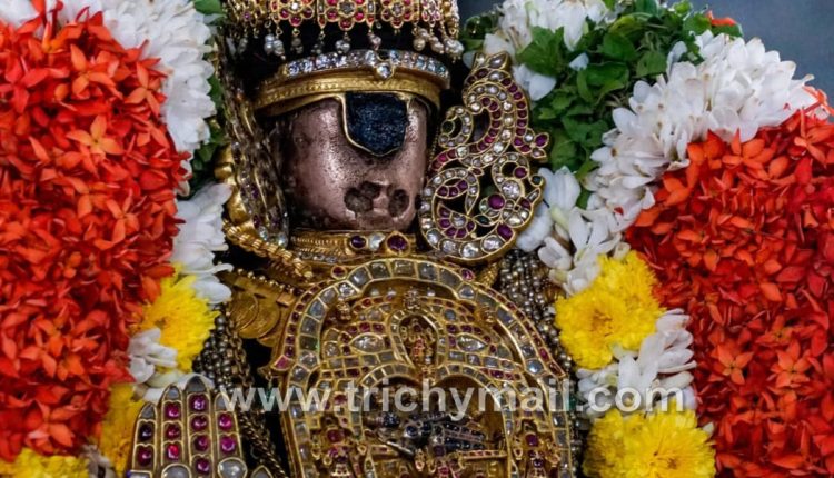ஸ்ரீநம்பெருமாள் – மாந்துளிர் நிற பட்டு அணிந்து சௌரிக் கொண்டை அணிந்து: அதில் கலிங்கத்துராய்; நெற்றி சரம், சூர்ய- சூர்ய வில்லை சாற்றி, மகர கர்ண பத்திரம்; ரத்தின அபய ஹஸ்தம்- தொங்கல் பதக்கம்;ரத்தின கடி அஸ்தம் (இடது திருக்கை), திரு மார்பில் ஆபரணங்களுகே ஏற்றம் தரும் -ஸ்ரீ ரங்க விமான பதக்கம், அடுக்கு பதக்கங்கள், நெல்லிக்காய் மாலை, 18 பிடி (6 வட) முத்து சரம் , காசு மாலை; அரைச் சலங்கை;