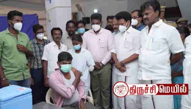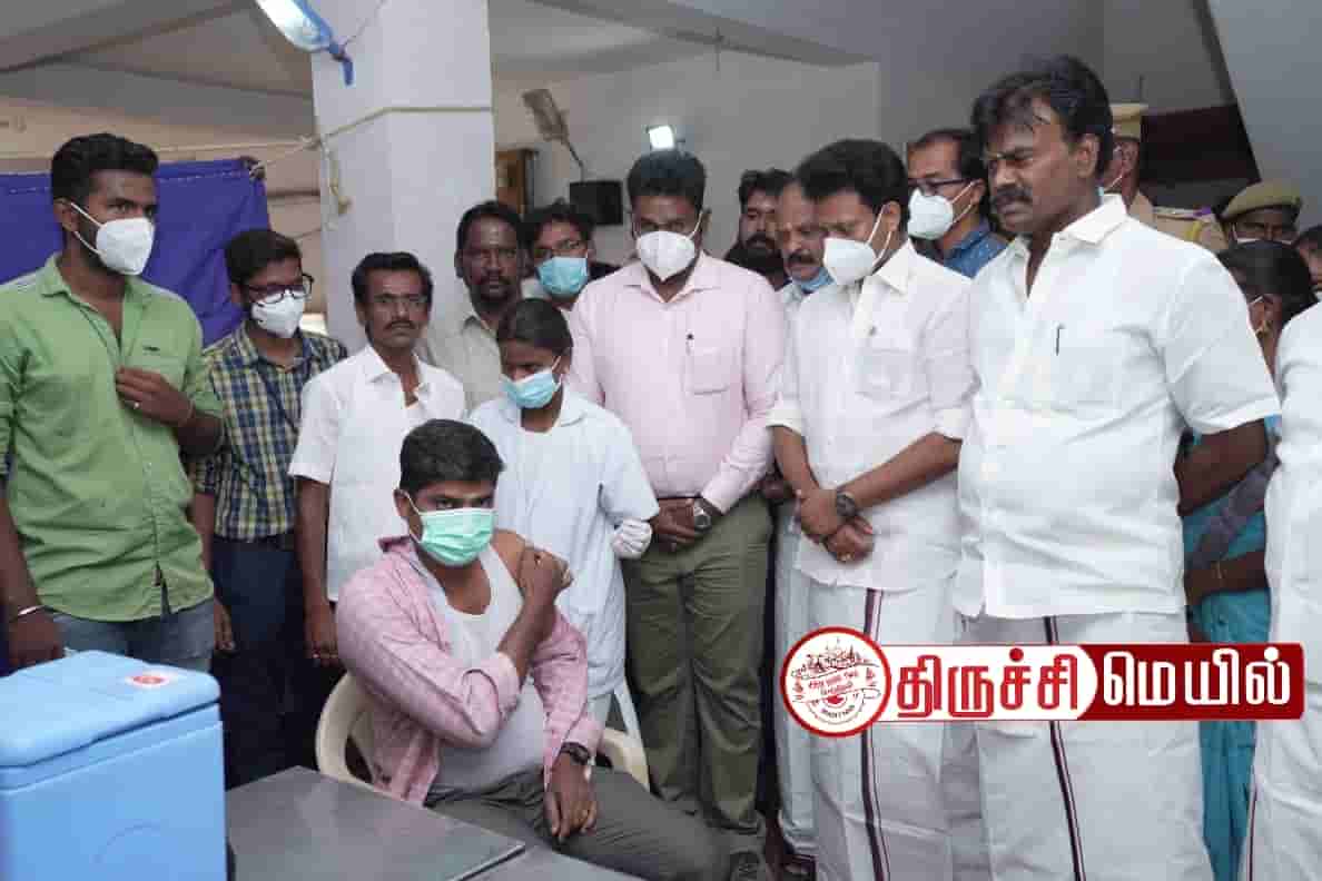திருவெறும்பூர் தொகுதி நவல்பட்டு அண்ணா நகர் பகுதியில் கொரேனா தடுப்பூசி முகாமை பள்ளிக்கல்வித்துறை அமைச்சர் அன்பில் மகேஷ் பொய்யாமொழி தொடங்கி வைத்தார்.