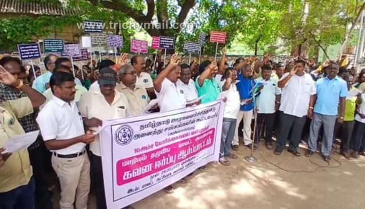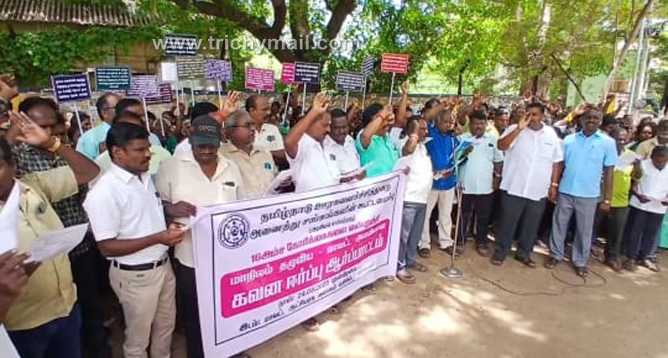 திருச்சி செப் 24 தமிழ்நாடு ஊரக வளர்ச்சித் துறை அனைத்து சங்கங்களின் கூட்டமைப்பு சார்பில் திருச்சியில் 16 அம்ச கோரிக்கைகளை வலியுறுத்தி கலெக்டர் அலுவலகம் அருகே இன்று ஆர்ப்பாட்டம் நடைபெற்றது.