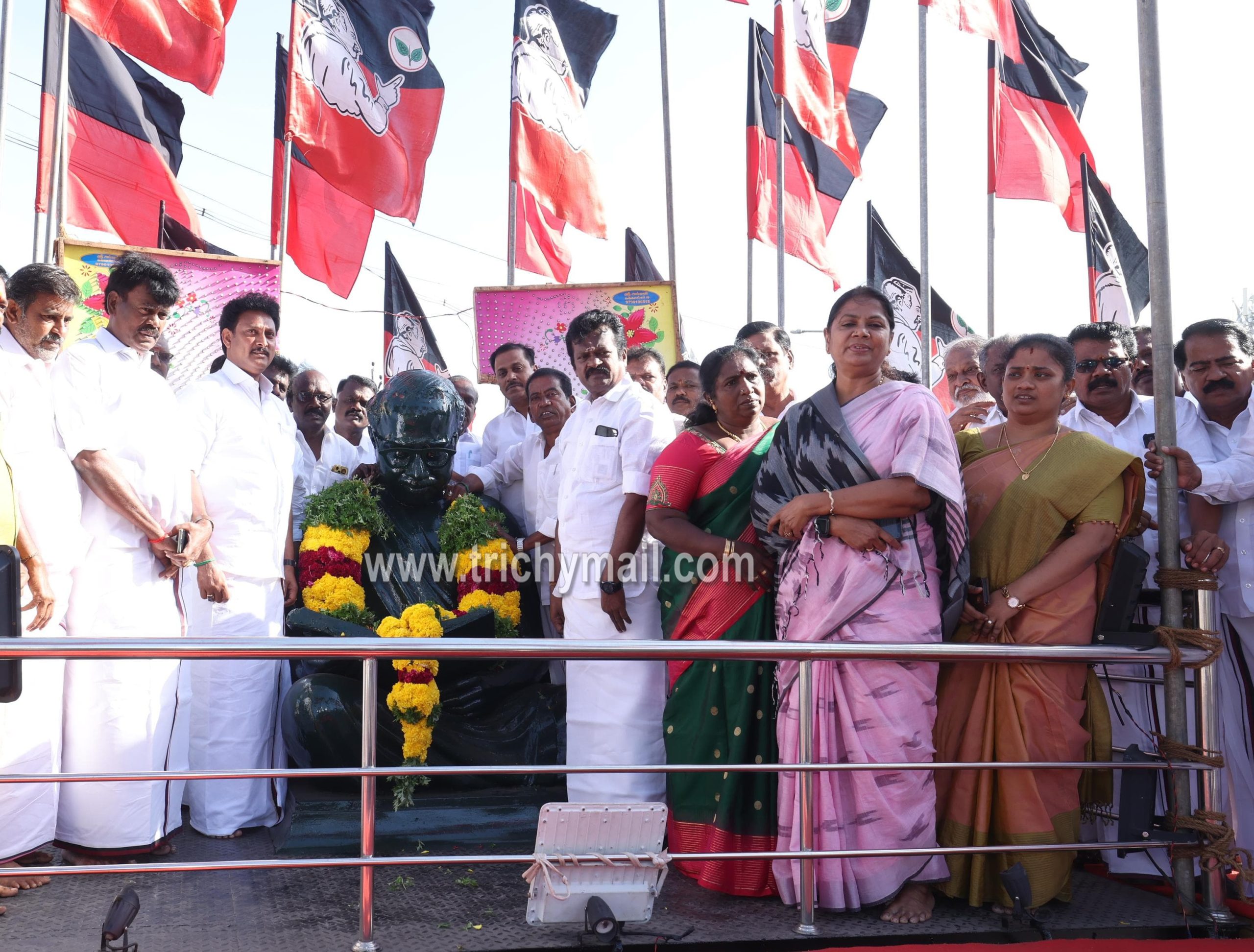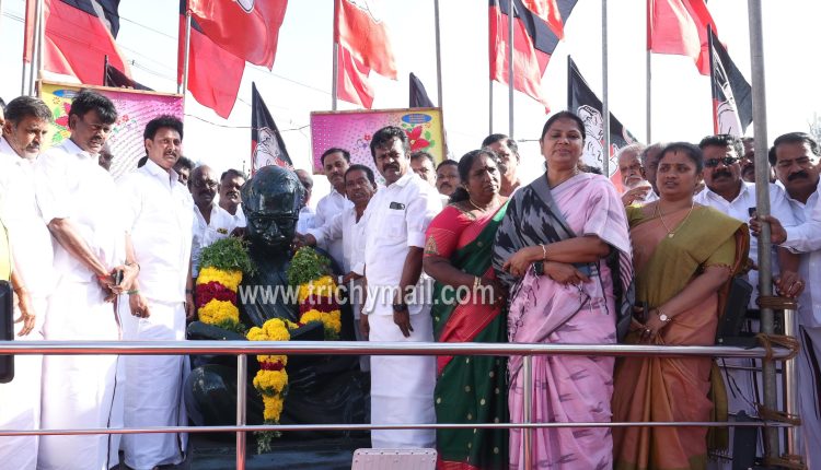 அதனைத் தொடர்ந்து கலைஞர் அறிவாலயத்தில் அமைந்துள்ள பேரறிஞர் அண்ணா மற்றும் கலைஞர் சிலைகளுக்கு மாலை அணிவித்து மரியாதை செலுத்தினார் அதனைத் தொடர்ந்து திருச்சி சென்னை தேசிய நெடுஞ்சாலையில் அமைந்துள்ள 70 அடி கொடிமரத்தில் கழக இரு வர்ண கொடியை ஏற்றி அனைவருக்கும் இனிப்புகளை வழங்கினார்.