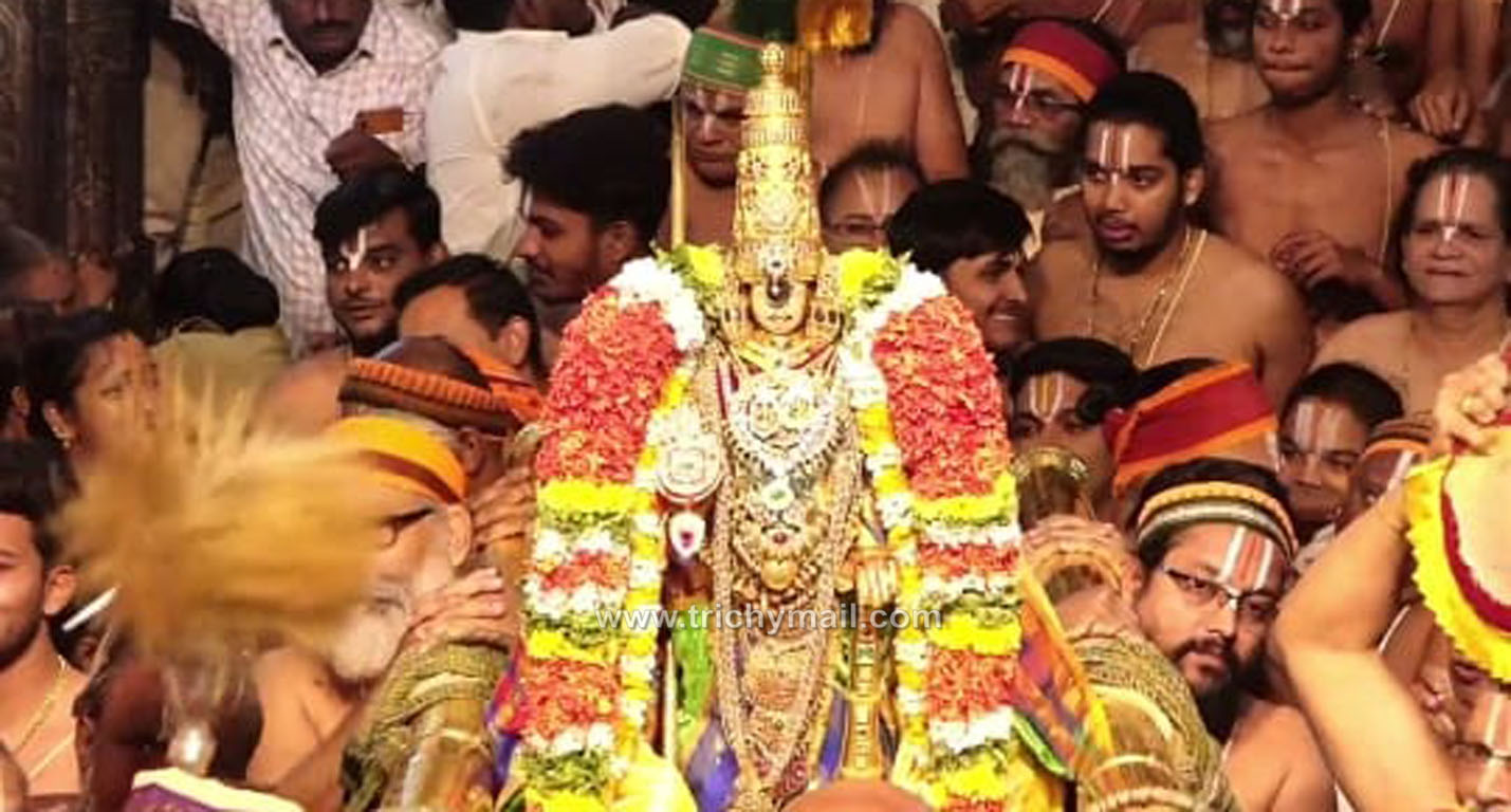 திருமார்பில் – பங்குனி உத்திர பதக்கம்,அதன் மேலே அழகிய மணவாள பதக்கம் – ஸ்ரீ ரங்கநாச்சியார் பதக்கம், வைரக்கல் ரங்கூன் அட்டிகை, சந்திர ஹாரம்,சிகப்பு கல் இழைத்த அடுக்கு பதக்கங்கள், நெல்லிக்காய் மாலை; அரைச் சலங்கை,8 வட முத்து மாலை; வைரக்கல் அபய ஹஸ்தம் – அதில் தொங்கல் பதக்கம் அணிந்து பச்சை பட்டு உடுத்தி சேவை சாதித்தார்.. விழாவின் முக்கிய நிகழ்வான வைகுண்ட ஏகாதசி பரமபத வாசல் திறப்பு வரும் டிசம்பர் 30ம் தேசி நடைபெறுகிறது.