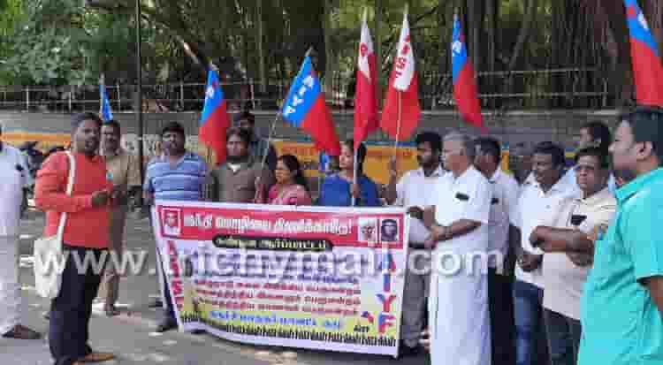 இந்தி திணிப்புக்கு எதிராக ஒன்றிய அரசை கண்டித்து அனைத்து அனைத்திந்திய மாணவர் பெருமன்றம், அனைத்திந்திய இளைஞர் பெருமன்றம், தமிழ்நாடு கலை இலக்கியப் பெருமன்றத்தின் சார்பில் 27. 10.2022 இன்று மாநிலம் தழுவிய ஆர்ப்பாட்டம் நடைபெற்றது. இதன் ஒரு பகுதியாக திருச்சி பிஎஸ்என்எல் தலைமை அலுவலகம் வாயில் முன் அனைத்திந்திய இளைஞர் பெருமன்ற மாவட்ட செயலாளர் எம்.செல்வகுமார், அனைத்திந்திய மாணவர் பெருமன்ற மாவட்ட செயலாளர் க.இப்ராஹிம் தலைமையில் கண்டன ஆர்ப்பாட்டம் நடைபெற்றது. இதில் தமிழ்நாடு கலை இலக்கிய பெருமன்றத்தின் மாநில செயற்குழு உறுப்பினர் எம்.செல்வராஜ், இந்திய கம்யூனிஸ்ட் கட்சியின் மாவட்ட செயலாளர் எஸ்.சிவா, அனைத்திந்திய மாணவர் பெருமன்ற மாநிலத் துணைச் செயலாளர் ஜி.ஆர். தினேஷ்குமார், தமிழ்நாடு கலை இலக்கிய பெருமன்றத்தின் மாவட்டச் செயலாளர் ஆநிரைச்செல்வன், பேராசிரியர் நெடுஞ்செழியன் ஆகியோர் கண்டன உரையாற்றினார்கள். மேலும் இடைக்கமிட்டுச் செயலாளர்கள் எம்.ஆர். முருகன், இரா.சுரேஷ் முத்துசாமி, சையது அபுதாஹிர் மற்றும் இளைஞர் பெருமன்ற மாவட்ட தலைவர் ஆர்.முருகேசன், மாணவர் மன்ற மாவட்ட தலைவர் பாட்ஷா மற்றும் தாஸ், மார்க்சிம் கார்கி, விஜி, ஏர்போர்ட் பகுதி பொறுப்பாளர் ராஜா, மேற்கு பகுதி குழு உறுப்பினர் ஆனந்தன் உள்ளிட்டோர் கலந்து கொண்டனர். இறுதியாக இளைஞர் பெருன்ற மாவட்ட நிர்வாக குழு உறுப்பினர் விஸ்வநாதன் நன்றி கூறினார்.