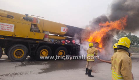திருச்சியில் இருந்து அரியலூரில் உள்ள சிமெண்ட் ஃபேக்டரிக்கு 200 டன் சுமை தூக்கும் ராட்சத கிரேன் வாகனம் சென்று கொண்டிருந்தது. அப்போது புள்ளம்பாடி அருகே கீழரசூர் திருச்சி சிதம்பரம் நெடுஞ்சாலையில் உள்ள சுங்கச்சாவடி பகுதியில் சென்று கொண்டிருந்தபோது இன்ஜினில் ஏற்பட்ட பழுதினால் திடீரென கிரேன் வாகனம் தீப்பற்றி எரிந்தது. தீவிபத்து ஏற்பட்டவுடன் கிரேன் வாகனத்தின் டிரைவர் கீழே குதித்து உயிர்த் தப்பினார்.இது குறித்து புள்ளம்பாடி தீயணைப்பு மற்றும் மீட்பு துறையினருக்கு தகவல் கொடுத்தனர்.தகவல் அறிந்த புள்ளம்பாடி தீயணைப்பு நிலைய அலுவலர் பொறுப்பு பாரதி தலைமையில் சிறப்பு நிலைய அலுவலர் சிவக்குமார், வீரர்கள் அமுதகுமார், அசாருதீன், ரமேஷ், குமார், கனகராஜ், அருண்ராஜ், பிரகாஷ் ஆகியோர் சம்பவ இடத்திற்கு விரைந்து சென்று தீயை கட்டுப்படுத்தியும் மற்றும் நுரைக் கலவையை பயன்படுத்தியும் தீயை முற்றிலும் அணைத்தனர். தீயணைப்பு்வீர்ர்கள் துரிதமாக செயல்பட்டதால் பெரும் சேதங்கள் மற்றும் அசம்பாவிதங்கள் தவிர்க்கப்பட்டது. இந்த தீபத்தால் அப்பகுதி முழுவதும் ஒரே புகை மண்டலமாக காட்சி அளித்தது விரைந்து செயல்பட்ட புள்ளம்பாடி தீயணைப்பு வீரர்களை அப்பகுதியில் சென்ற வாகன ஓட்டிகள் வெகுவாக பாராட்டினார்கள். இந்த தீபத்தில் டிரைவர் உட்பட யாரும் காயமின்றி அதிர்ஷ்டவசமாக உயிர்த் தப்பினார்கள்