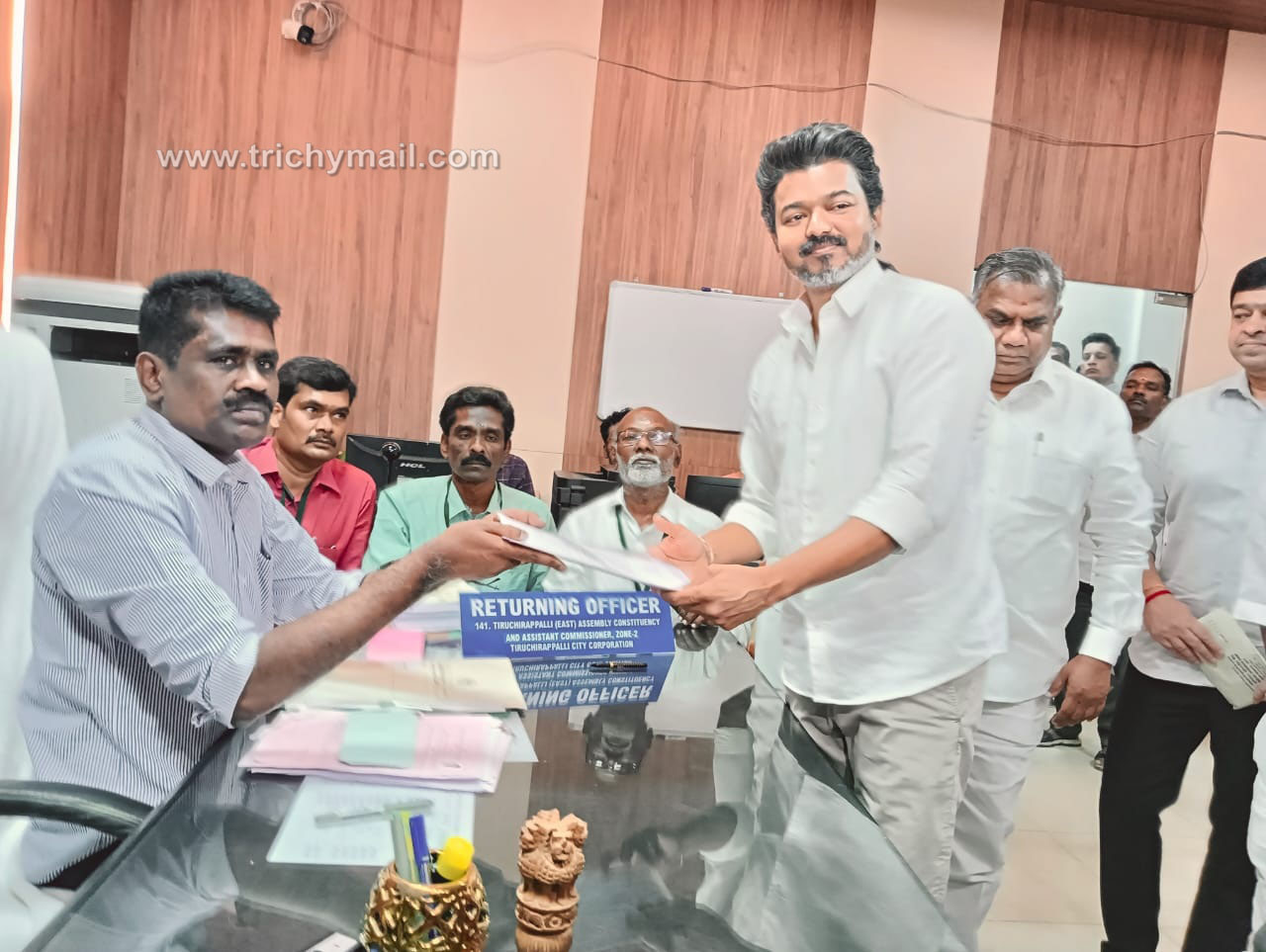 திருச்சி, ஏப். 2  திருச்சி கிழக்கு தொகுதியில் போட்டியிடும் த.வெ.க தலைவரும் நடிகருமான விஜய் கிழக்குத் தொகுதி தேர்தல் நடத்தும் அலுவலர் முத்து முருகேச பாண்டியனிடம் வேட்புமனு தாக்கல் செய்தார். சுமார் ஒரு மணி நேரம் காத்திருந்து 12:30 மணிக்கு நல்ல நேரத்திற்கு பின்பு அவர் வேட்பு மனு தாக்கல் செய்தார்