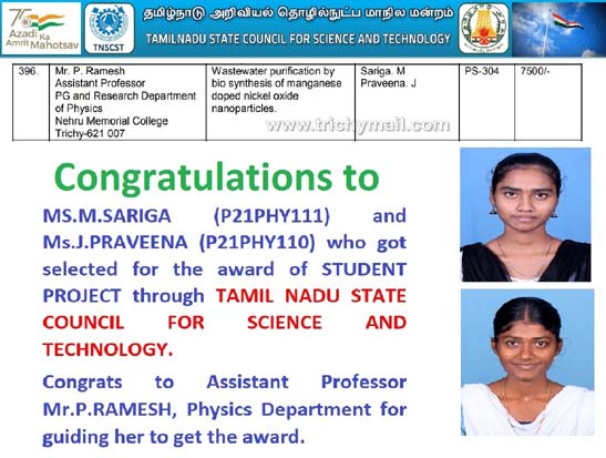 நேரு நினைவு கல்லூரியில் இரண்டாம் ஆண்டு முதுநிலை இயற்பியல் பயிலும் M.சரிகா மற்றும் J.பிரவினா ஆகிய மாணவிகள் கிரீன் நானோ தொழில்நுட்பம் மூலம் கழிவுநீரை சுத்திகரிப்பதற்கான தமிழ்நாடு அறிவியல் தொழில்நுட்ப மன்றத்திற்கு மூன்று மாதத்திற்கு முன்னர் ஆய்வு சுருக்கம் சமர்ப்பித்தனர். இந்த ஆய்வு சுருக்கத்தை பரிசீலித்து, இந்த ஆய்வு செய்வதற்காக 7500 நிதியுதவி அளித்துள்ளது.
