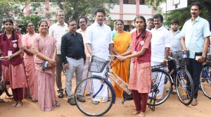 திருச்சி பொன்மலைப்பட்டி பகுதியில் உள்ள புனித வளனார் பெண்கள் மேல்நிலைப் பள்ளியில் விலையில்லா மிதிவண்டிகள் வழங்கும் விழா இன்று நடைபெற்றது இவ்விழாவில் பள்ளி கல்வித்துறை அமைச்சர் அன்பில் மகேஷ் பொய்யாமொழி கலந்துகொண்டு மாணவ மாணவிகளுக்கு விலையில்லா மிதிவண்டிகளை வழங்கினார்.