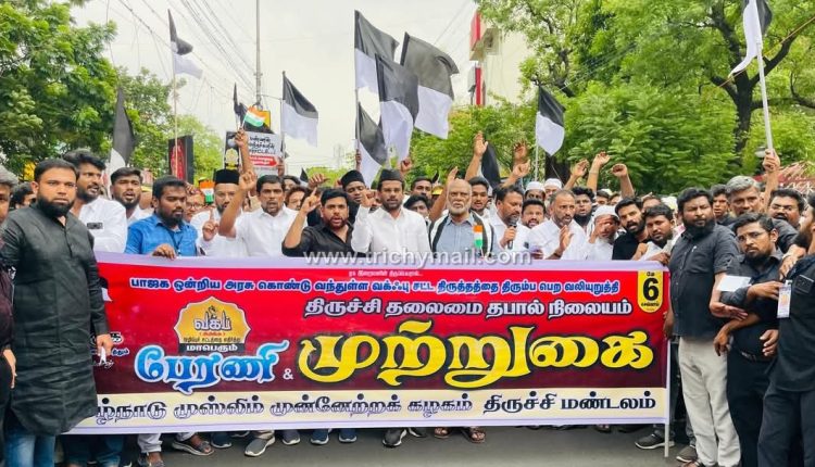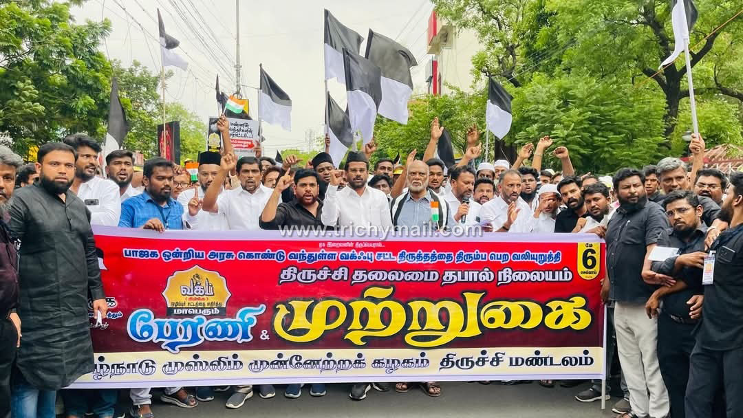 திருச்சி, மே 7  தமிழ்நாடு முஸ்லிம் முன்னேற்றக் கழகத்தின் திருச்சி மண்டலம் சார்பில் ஒன்றிய அரசின் வக்ஃப் திருத்தச் சட்டம் 2024 ஐ கண்டித்து RC பள்ளி அருகில் இருந்து பேரணியாக புறப்பட்டு திருச்சி தலைமை தபால் நிலையத்தை முற்றுகையிடும் போராட்டம்  நேற்று மாலைநடைபெற்றது.