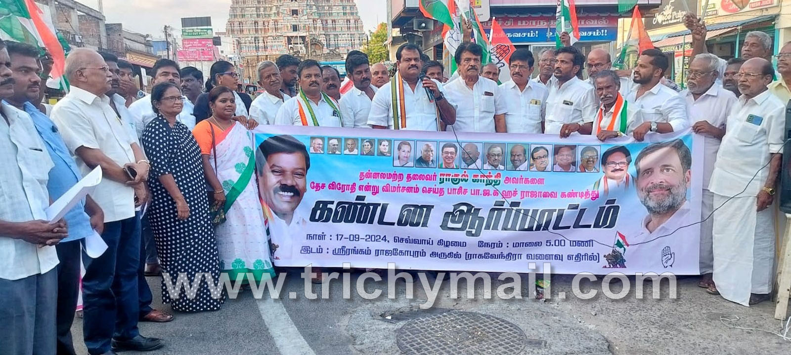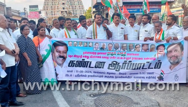 பாராளுமன்ற எதிர்க்கட்சித் தலைவர் ராகுல் காந்தி தேச விரோதி என்று பாரதிய ஜனதா கட்சியின் பொறுப்பு குழு தலைவர் எச் ராஜாவை கண்டித்து கண்டன ஆர்ப்பாட்டம் ஸ்ரீரங்கம் ராஜகோபுரம் அருகில் திருச்சி மாநகர் மாவட்ட காங்கிரஸ் தலைவர் கவுன்சிலர் எல்.ரெக்ஸ் தலைமையில், ஸ்ரீரங்கம் கோட்ட தலைவர் ஜெயம் கோபி மற்றும் திருவானைக்கோவில் கோட்ட தலைவர் தர்மேஷ் ஆகியோர் முன்னிலையில் நடைபெற்றது. தமிழ்நாடு காங்கிரஸ் கமிட்டி செய்தி தொடர்பாளர் திருச்சி வேலுசாமி கண்டன உரையாற்றினார்.