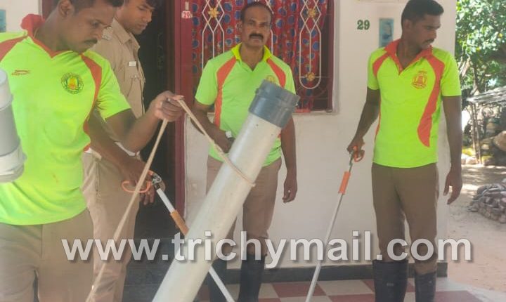 திருச்சி, ஜூலை 12  திருச்சி மாவட்டம் லால்குடி அருகே மணக்காலில் சமையல் அறைக்குள் புகுந்த 5 அடி நீளமுள்ள நல்ல பாம்பை லால்குடி தீயணைப்பு வீரர்கள்  உயிருடன் மீட்டனர்.