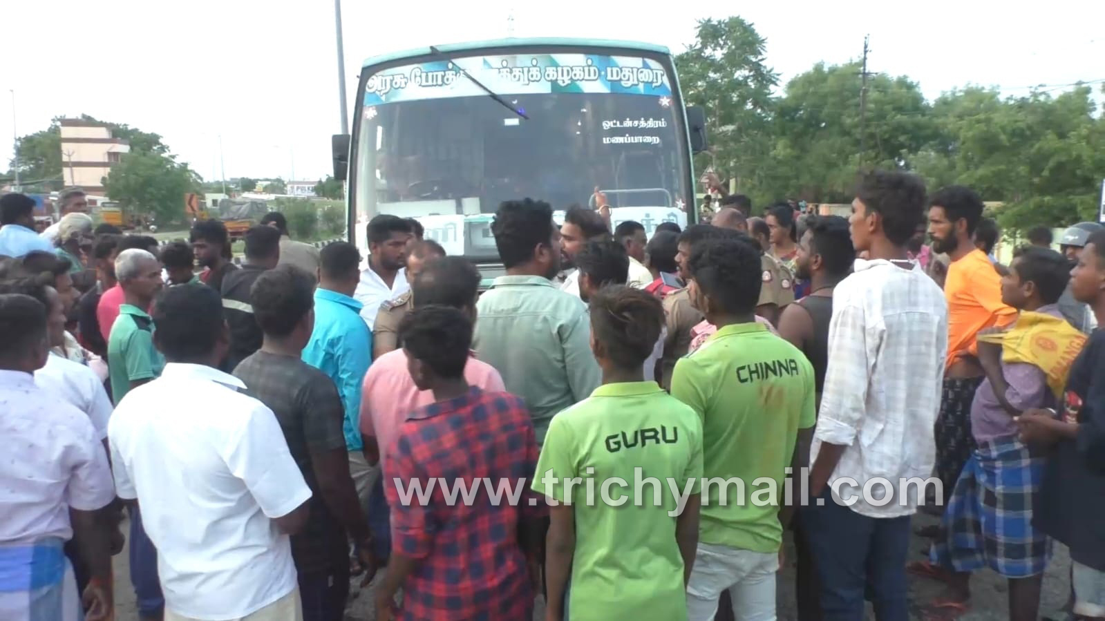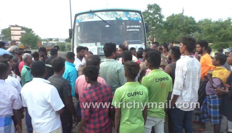 இதுபற்றிய தகவலை அந்தப் பெண் மணப்பாறையில் உள்ள தனது குடும்பத்தினருக்கு தகவல் தெரிவிக்கவே ஆத்திரமடைந்த குடும்பத்தினர் மற்றும் நண்பர்கள் மணப்பாறை அருகே பொத்தமேட்டுப்பட்டி பகுதிக்கு வந்த போது பஸ்சை சிறைபிடித்து போராட்டத்தில் ஈடுபட்டனர்.