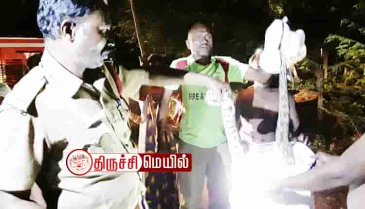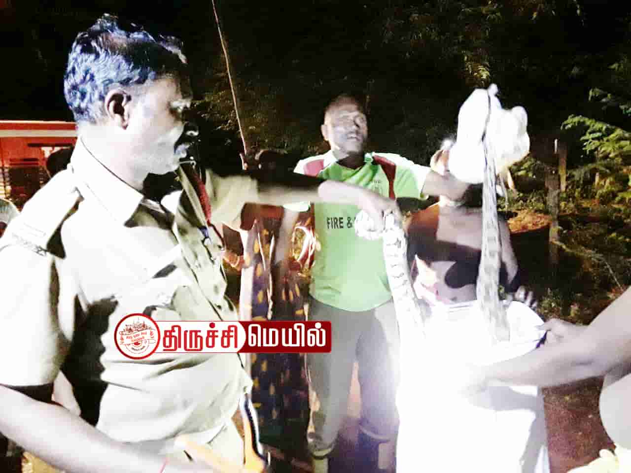 திருச்சி மாவட்டம், வளநாட்டை அடுத்த ஊனையூர் அருகே உள்ள, பெரிளஅருளாப்பட்டியைச் சேர்ந்தவர் பழனிச்சாமி. இவர் தனது வீட்டின் அருகே ஆட்டுப்பட்டி அமைத்து அதில் ஆடுகளை வளர்த்து வருகிறார். இந்த நிலையில் ஆட்டுப்பட்டியில் அடைத்து வைக்கப்பட்டிருந்த ஆடுகள் சப்தம் போடவே எழுந்து வந்து பார்த்துள்ளார். அப்போது பெரிய மலைப்பாம்பு ஒன்று ஆட்டை விழுங்கிடுவதற்காக விரட்டிச் சென்றதைப் பார்த்து அதிர்ச்சி அடைந்தார். உடனே இதுபற்றி தீயணைப்பு துறையினருக்கு தகவல் கொடுத்தார்.