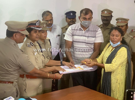 நகையை பறிகொடுத்தவர்களிடம் மாநகர காவல் துறை ஆணையர் சத்தியப்பிரியார் நகையை ஒப்படைத்தார் மேலும் குற்றவாளிகளை பிடித்த தனிப்படை போலீசாருக்கு காவல்துறை ஆணையர் சன்மானம் வழங்கினார்