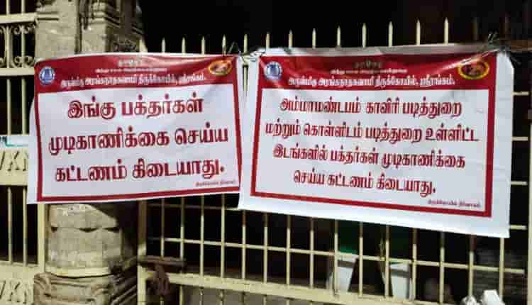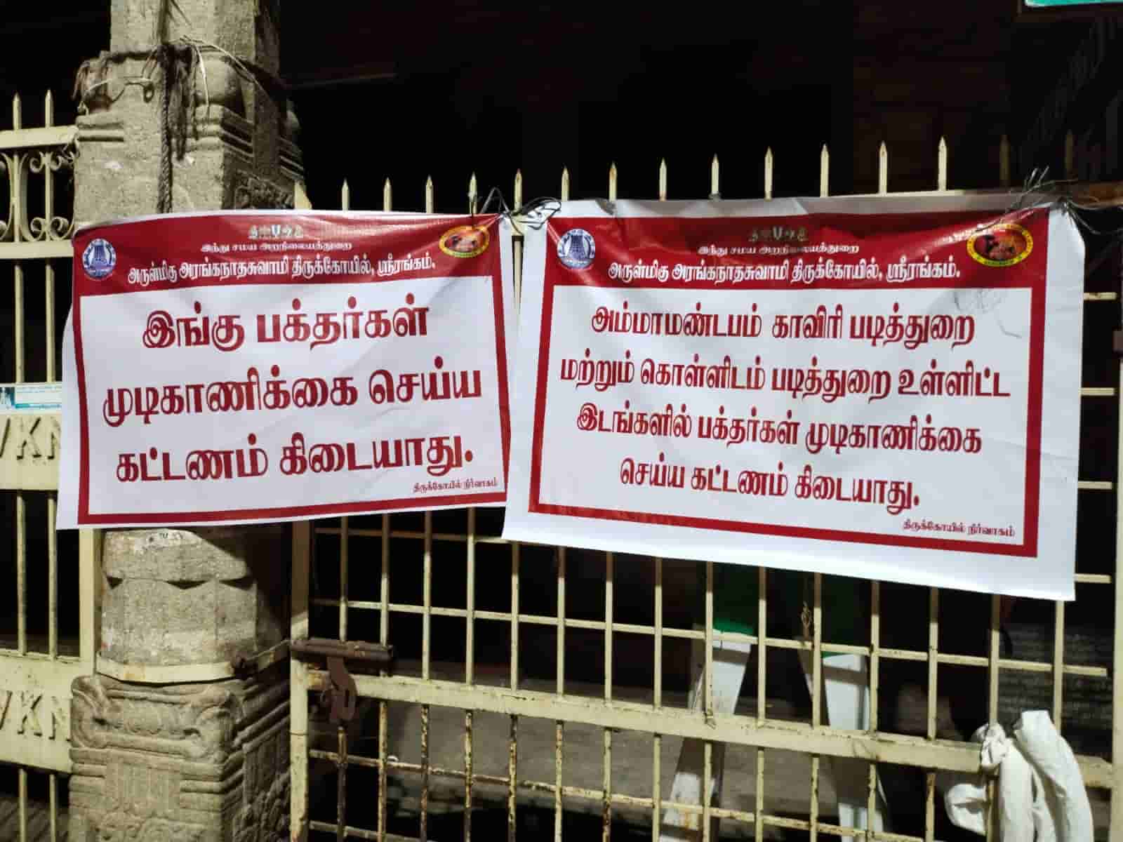 இந்த அறிவிப்பை பக்தர்கள் அறியும் வண்ணம் உடனடியாக அறிவிப்பு பதாகை வைக்க இந்துசமய அறநிலையத்துறை ஆணையர் குமரகுரு அனைத்து கோயில்களுக்கும் சுற்றறிக்கை அனுப்பி இருந்தார். அதன்படி ஸ்ரீரங்கம் அரங்கநாத சுவாமி திருக்கோயில் நிர்வாகம் சார்பாக முடி காணிக்கை செலுத்தும் இடமான அம்மா மண்டபம் காவிரிபடித்துறை, கொள்ளிடம் படித்துறை மற்றும் கோயிலின் மூன்று வாயில்களிலும் உடனடியாக பக்தர்கள் அறியும் வண்ணம் அறிப்விப்பு பதாகை வைக்கப்பட்டது