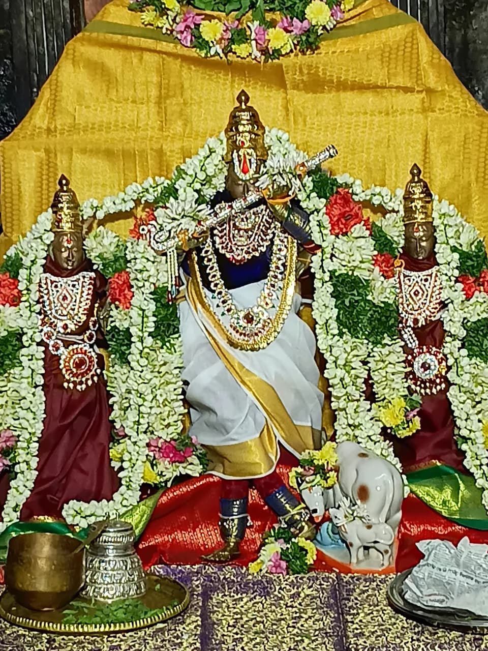 திருச்சி, செப்.24 திருச்சி திருவானைக்காவல் அருள்மிகு ஶ்ரீ வேணுகோபால சுவாமி திருக்கோயில் நவராத்திரி விழா இரண்டாம் நாள் இன்று மூலவர் சன்னதியின் ருக்மணி மற்றும் சத்தியபாமா சமேத ஶ்ரீ வேணுகோபல சுவாமி பசு கன்றுவுடன் அருள்பாலிக்கிறார்