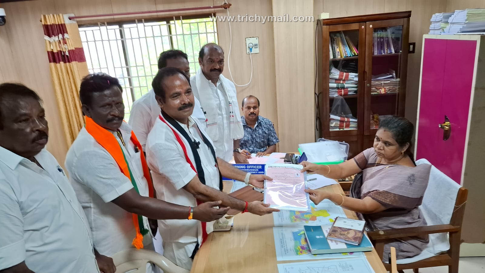 திருவெறும்பூர் அதிமுக வேட்பாளர் ப.குமார் தேர்தல் நடத்தும் அலுவலர் அமுதாவிடம் தனது வேட்பு மனுவை தாக்கல் செய்தார்