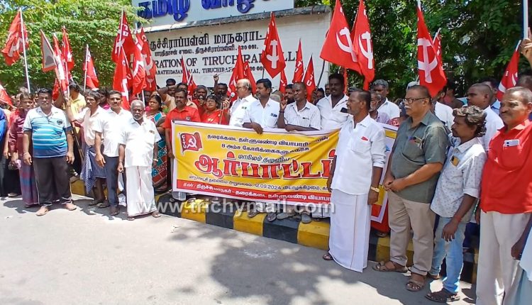 ஆர்ப்பாட்டத்திற்கு சாலையோர வியாபாரிகள் சங்க மாவட்ட தலைவர் கணேசன் தலைமை தாங்கினார். சாலையோர வியாபாரிகள் சங்க மாவட்ட செயலாளர் செல்வி, சிஐடியு திருச்சி மாநகர் மாவட்ட செயலாளர் ரங்கராஜன், சாலையோர வியாபாரி சங்க மாவட்ட பொருளாளர் சுரேஷ் ஆகியோர் கண்டன உரையாற்றினர்.