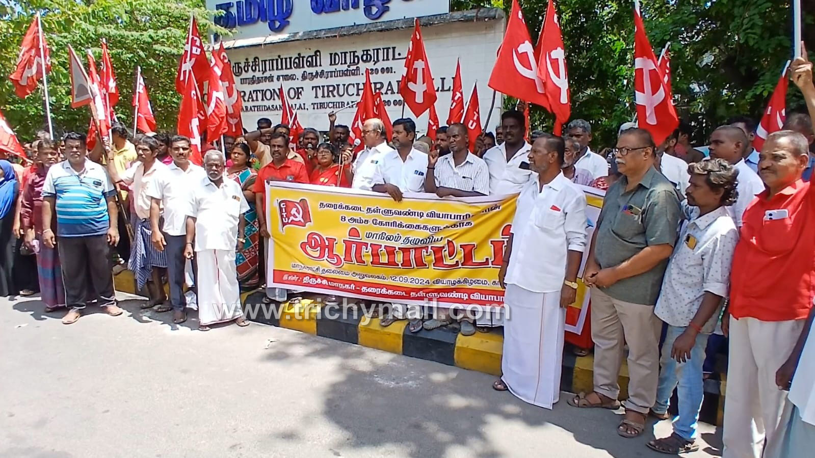 திருச்சி மாவட்ட தள்ளுவண்டி  தரைக்கடை மற்றும் மார்க்கெட் வியாபாரிகள் சங்கம் சார்பில் பல்வேறு கோரிக்கைகளை வலியுறுத்தி மாநிலத் தழுவிய ஆர்ப்பாட்டம் திருச்சி மாநகராட்சி தலைமை அலுவலகம் முன்பு இன்று நடைபெற்றது.