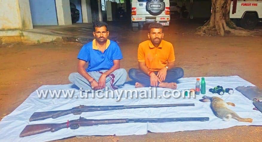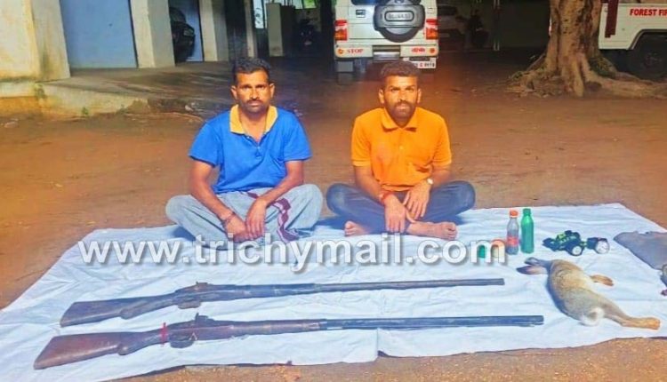 திருச்சி, ஜன.19 திருச்சி மாவட்டம் உப்பிலியபுரத்தை அடுத்துள்ள புளியஞ்சோலை பகுதியில் சட்டவிரோதமாக நாட்டுத் துப்பாக்கிகளுடன் முயல் வேட்டையாடிய இருவரை வனத்துறையினர் கைது செய்துள்ளனர்