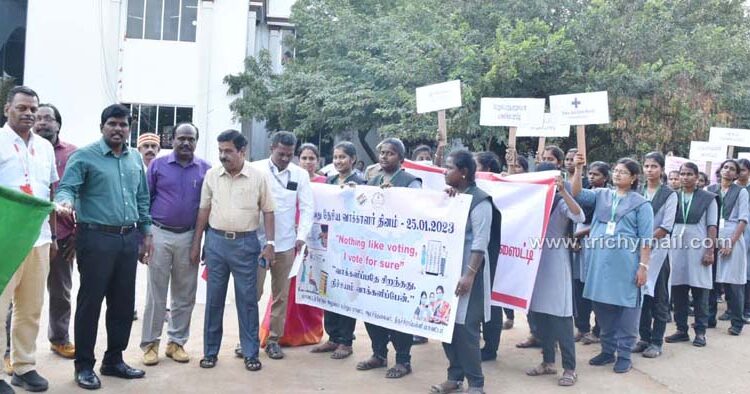 திருச்சி, ஜன.28 தேசிய வாக்காளர் தினம் கடந்த 25- ஆம் தேதி கொண்டாடப்பட்டது. இதனையொட்டி நேற்று மாலை திருச்சி மாவட்ட ஆட்சியர் அலுவலகத்தில் கல்லூரி மாணவ -மாணவிகளின் வாக்காளர் விழிப்புணர்வு ஊர்வலம் நேற்று நடைபெற்றது. மாவட்ட ஆட்சியர் பிரதீப் குமார் ஊர்வலத்தை கொடியசைத்து தொடங்கி வைத்தார். ஊர்வலம் மாவட்ட ஆட்சியர் அலுவலக சாலை வழியாக சென்று நீதிமன்றம் அருகே நிறைவடைந்தது. இதில் மாவட்ட ஆட்சியரின் நேர்முக உதவியாளர் (தேர்தல்) வைத்தியநாதன், தேர்தல் தனி வட்டாட்சியர் முத்துசாமி ஆகியோர் கலந்து கொண்டனர்.